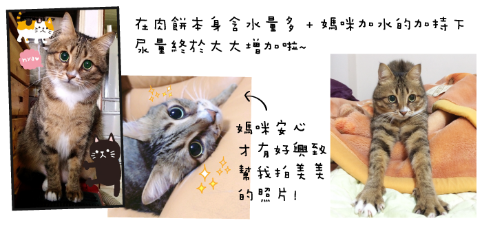 之後就趁線上寵物展時訂了三種貓用口味各一箱,可以變換口味。貓咪本身就是肉食性動物,好的肉及多喝水讓熊熊恢復健康、活力滿滿,尿量變多,不太會軟便或拉稀了。雖然有時候不小心加太多水熊熊還是會抗議,把肉叼出來想少喝水,但後來還是會乖乖把整碗吃光光。真的很謝謝巴夫,希望下次健檢的數字就會很好看囉!