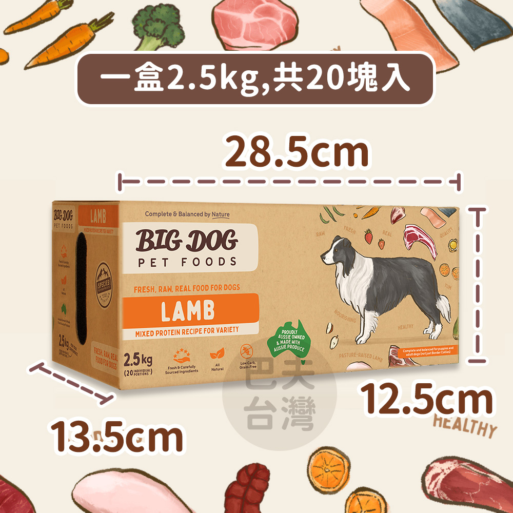 ※ 調整成分:羊(肉、肝、心、磨碎羊骨和軟骨、脾、肺、腎、氣管)、雞(肉、碎骨和軟骨)、整尾鮭魚(含鱗)、季節蔬果(蘋果、青香蕉、紅蘿蔔、萵苣、四季豆、小麥草芽、柑橘、草莓、藍莓)、全蛋(含殼)、山羊乳清、洋車前子粉、海帶、有機富里酸。